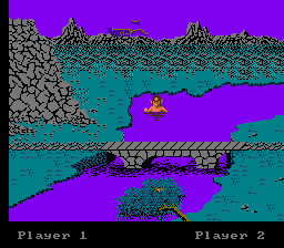 Nothing really happens when you have completed a level except you are taken to the level select menu again, if you loose there does not seem to be any game over screen or anyting similar. This version of Crossbow is also credited to Sharedata, the parent company of American Game Carts Inc., meaning development must have begun very early on as some early copies of Chiller also were credited to Sharedata.