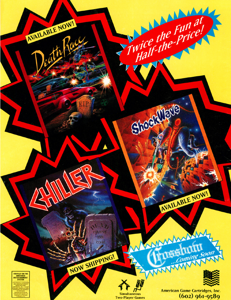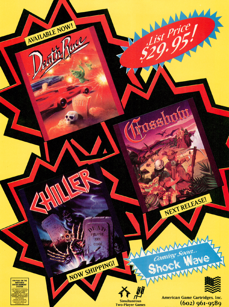 American Game Carts Inc only ever released 3 games, Chiller, Death Race and Shockwave. A fourth game, Wally Bear and the NO! Gang was eventually released by American Video Entertainment, although a few cartridges are known to exist in AGCI carts with an AGCI label on it as well, but it’s unknown if they were just production samples for what was meant to be, but eventually did not pan out.