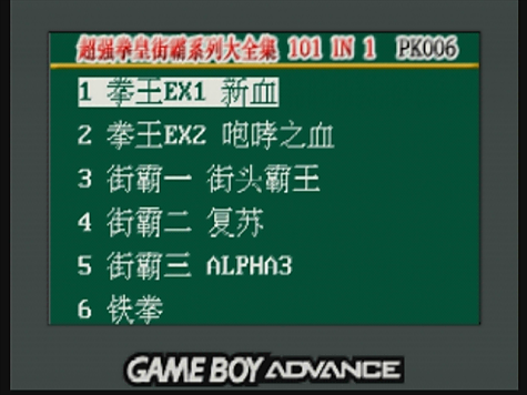 Next up there's a pretty cool looking menu, which sadly isn't in english but also makes sense that it's not. Pressing right or left switches pages in the menu, you can find a complete list of games in the column on the right, and yeah the cart "only" contains 16 GBA games. But that's a record for any GBA multicart I've seen sofar and for $8 including shipping. What's funny about this cart too is that some GBA games have an extra titlescreen added.