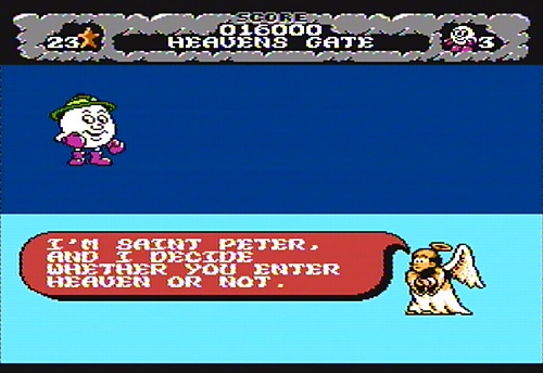 The game itself it quite short to be honest and is basicly one "big" stage, this is probably why it wasn't released as a regular game, but has a really nice story - a lot of text, which can be skipped (fortunately) by pressing up and down on the D-pad. Not that I recommend doing it as you'll miss a lot of the fun of playing the game, such as Dizzy's amazing joke to cheer up a princess in the game - why did the mushroom cross the road? because he's a nice guy! yeah ehhh okay great joke.