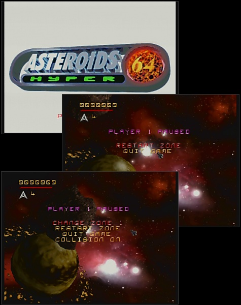 Start a new game in Asteroids Hyper 64, hit the START button to Pause at any point.