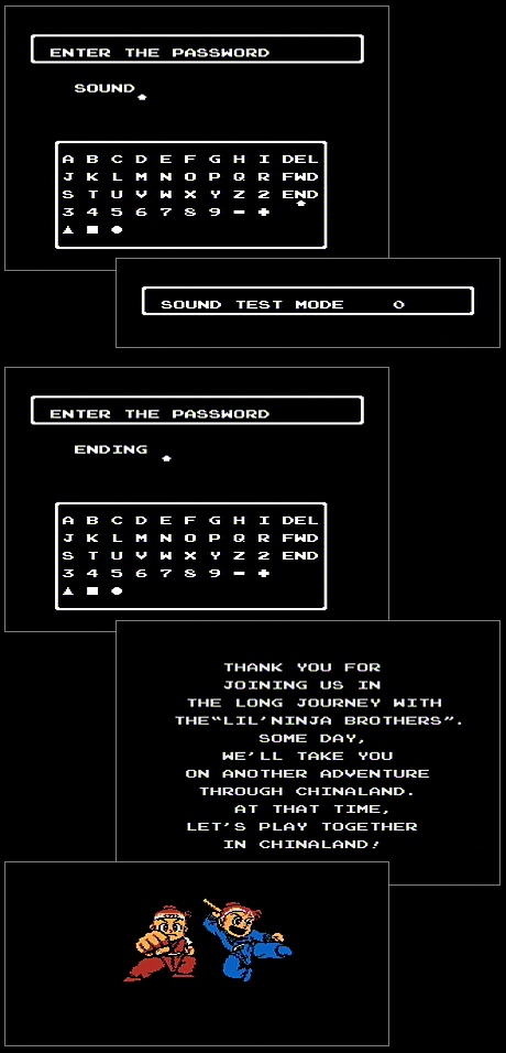At the password screen, type SOUND to proceed to a secret sound test screen. If you at the password screen type ENDING then you'll be taken directly to the game ending screens.