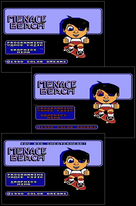 On the titlescreen press LEFT, SELECT, LEFT (x 6), UP (x 6), RIGHT (x 6), B and the text 'You big cheaterhead!' appears. The text and eyes of the menace dude on the titlescreen turns red when the right key combination is being pressed.