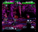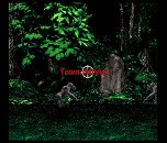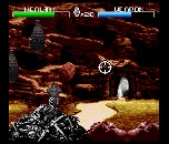 Essentially, the early game play involved Monroe moving freely on the playfield while avoiding hostile wildlife. Technologically, we wanted to strive for as much physical accuracy as our respective platforms would allow. To that end, we incorporated polar movement deltas, based on angle and distance - dx = sin(q); dy = cos(q) - rather than its XY Cartesian counterparts; this ensured that the player moved at the same speed on the diagonals as on an axis. Also, turning the character 180 degrees resulted in his sprite actually turning around quickly, never simply “popping”. The SNES programmer even pushed for a variegated playfield height plane, with hills and valleys, though the final consensus was to follow the more conventional lead of these other games and use a flat playfield due to unknown difficulties such a playfield would introduce for the artists. We developed zebra, hyena, and other game objects and developed an AI scripting system based on macros whereby scripts could be written once and then shared in both the SNES and Genesis code bases. The end result: a very high-quality game engine, complete with all the “fluff” - dust at Monroe’s feet on dusty ground, white bang stars and quick sub-second frame-freezing for impact emphasis (as seen in many fight games), screen shakes, and one very major problem.