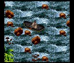 The SNES programmer had been able to salvage much of his earlier work from the original Congo engine - the Task Manager, the Object System framework, and parts of the Playfield Manager, as well as some general screen special effects including color fading, transitions, and a proportional font-printing engine. The water effects in the River Ride levels reflect some of this earlier work and combine column-shifting with H-DMA to produce a pleasing ripple effect.