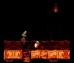 The Platform Run was our internal name for the third set of non-shooting playfield-based levels. We had originally come up with the idea to have Karen riding a rickety platform with wheels - an ancient cart turned skateboard. The SNES programmer came up with the physics for this level, and the platform would slow down going up slopes and accelerate downward. When the player hit the jump button, Karen had to land on the platform when she came down, adding to the game play. However, the marketing geniuses at Viacom decided that the Platform was too inappropriate, not enough like the movie. With no room for schedule slippage, we were forced to keep the original physics engine designed for Karen riding the cart (Karen ala cart?) but remove the latter and have Karen simply running through the level. We quickly gave Karen a whip to make up for the lost gameplay and added “whip points”. This last-minute, ad-hoc change due to the shortsightedness of our client compromised what could have been the most fun and appealing level of the game, in this writer’s opinion. But, “the customer’s always right”. To be fair, these levels do have a certain appeal. They require the best timing, as the player uses only the jump button. Moreover, the whip, when latched to a pole, can be held for a variable length of time, allowing the player to determine the direction of Karen’s swinging release.